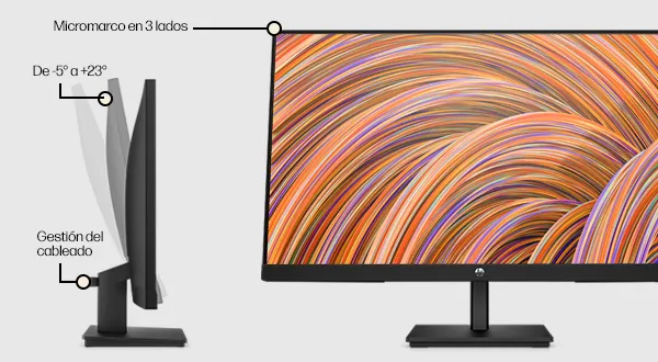 Ajuste funcional con diseño modernoOrdena tu escritorio y mantén la atención puesta en la pantalla gracias al elegante bisel con microborde en 3 lados, la ordenada distribución de los cables y el delgado soporte con inclinación ajustable para que puedas disfrutar de una vista perfecta. |